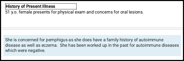 The main thing worth noting from this first visit was that she knew that both DIF and H&E biopsies are the standard tests performed for the diagnosis of autoimmune blistering disorders. They should have been part of her routine diagnostic steps from the very beginning. She also had no clue that the desmoglein auto-antibody bloodwork is not a diagnostic tool. She didn’t even know how to spell desmoglein!