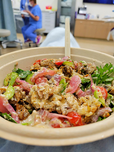 I didn’t feel anything unusual during the Truxima infusion. I was still a little woozy from the benadryl, but I was never able to actually sleep. I talked to my husband. I watched Food Network. I texted with friends and chatted with the nurses. I ate CAVA for lunch – so delicious – and my mouth even tolerated the tomatoes, pickled red onions, and vinaigrette! V encouraged me to drink extra water throughout the day, which meant I had go wheeling to the bathroom with my IV stand a few times. That was easier than I expected, too. I just unplugged myself and rolled out! I brought my laptop and my iPad with me to infusion day, but I never even got them out of the bag.